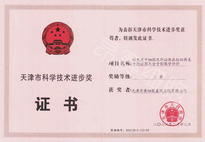 我司與南開大學(xué)、天津市人民醫(yī)院共同申報的項目《間充質(zhì)干細(xì)胞及外泌體在組織再生中的應(yīng)用與分子影像學(xué)評價》獲得2021年度天津市科學(xué)技術(shù)進(jìn)步獎二等獎。